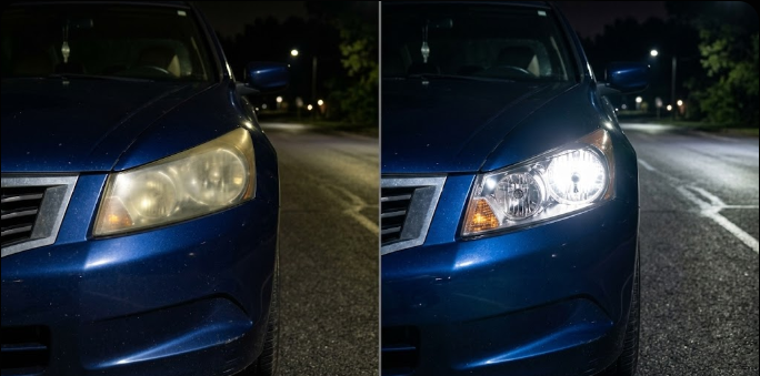 If your headlight cover is yellowed or oxidized, light output is already compromised. Before considering LEDs, perform a proper classic car headlight restoration:
